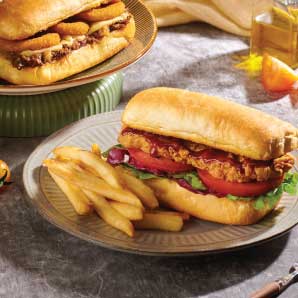 Tender, seasoned chicken on panini bread, paired with deep-fried high quality fries.