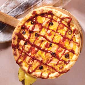 Thin& crispy dough with chicken bologna, chicken chunks, pineapple chucks and onion rings.