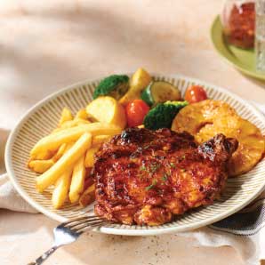 Specially marinated chicken chop baked with pineapple slices and laced with a rich, full flavour sweet hickory BBQ sauce.