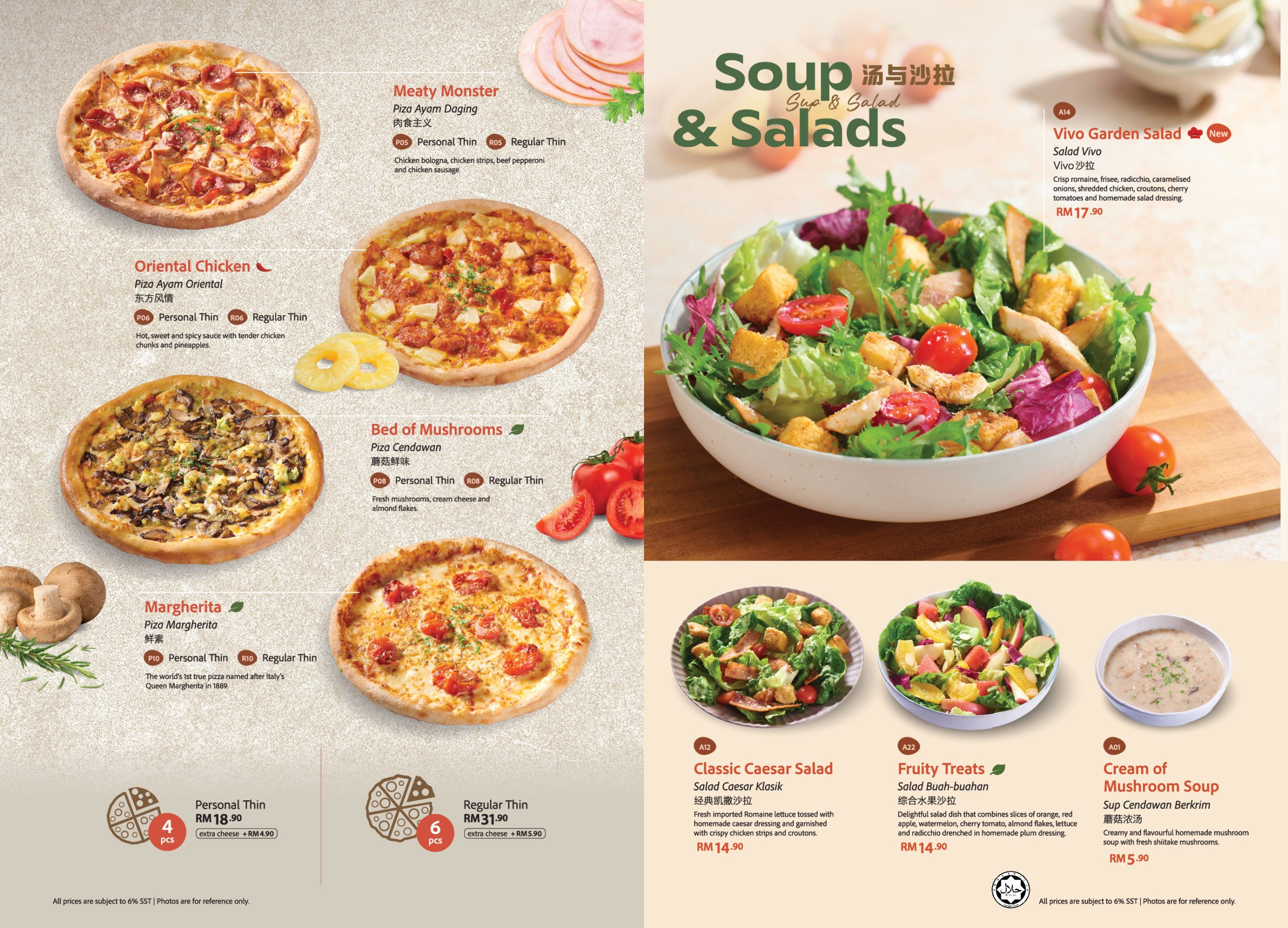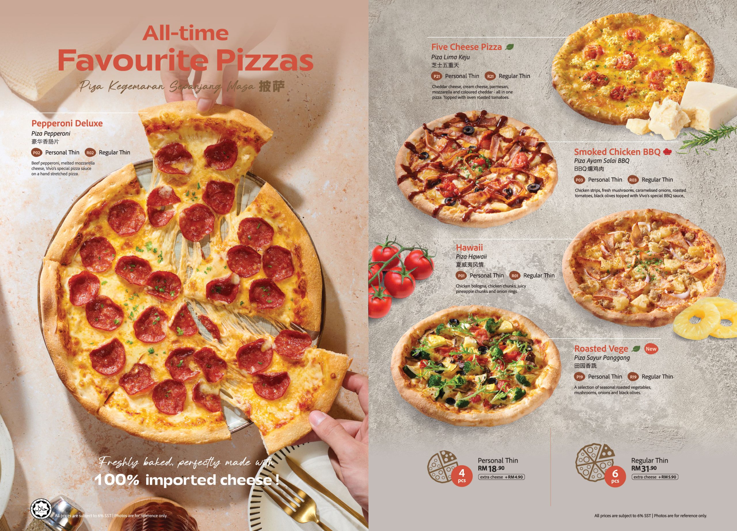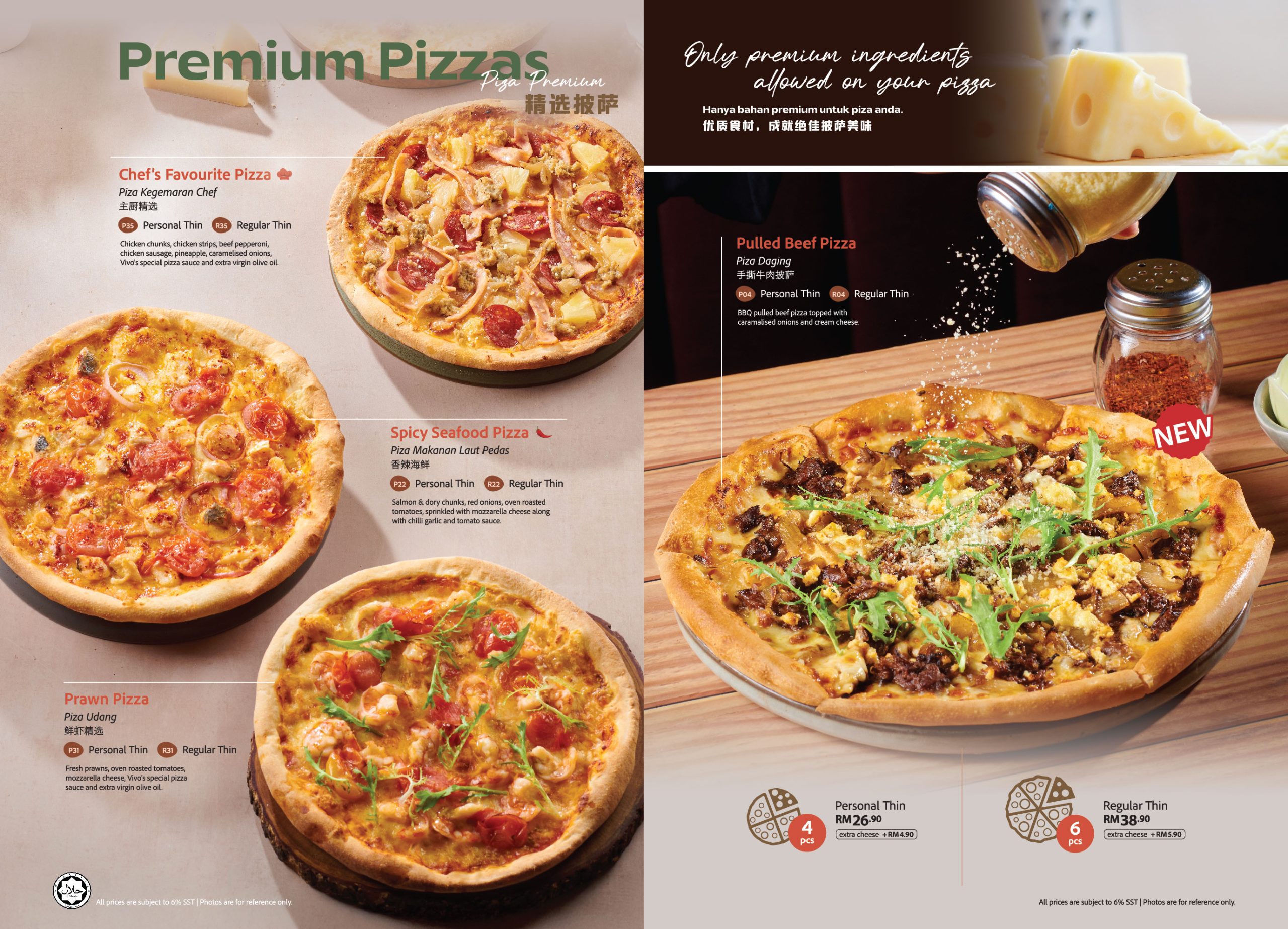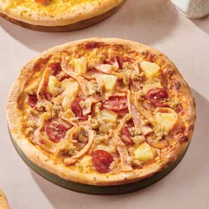 Chicken chunks, chicken strips, beef pepperoni, chicken sausage, pineapple, caramelised onions, Vivo's special pizza sauce and etxra virgin olive oil.