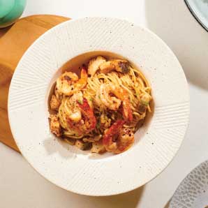 Spicy spaghetti with-fresh prawns, salmon & dory chunks, stir-fried in garlic and olive oil.