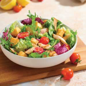 Crisp romaine, frisee, radicchio, caramelised onions, shredded chicken, croutons, cherry tomatoes and homemade salad dressing.